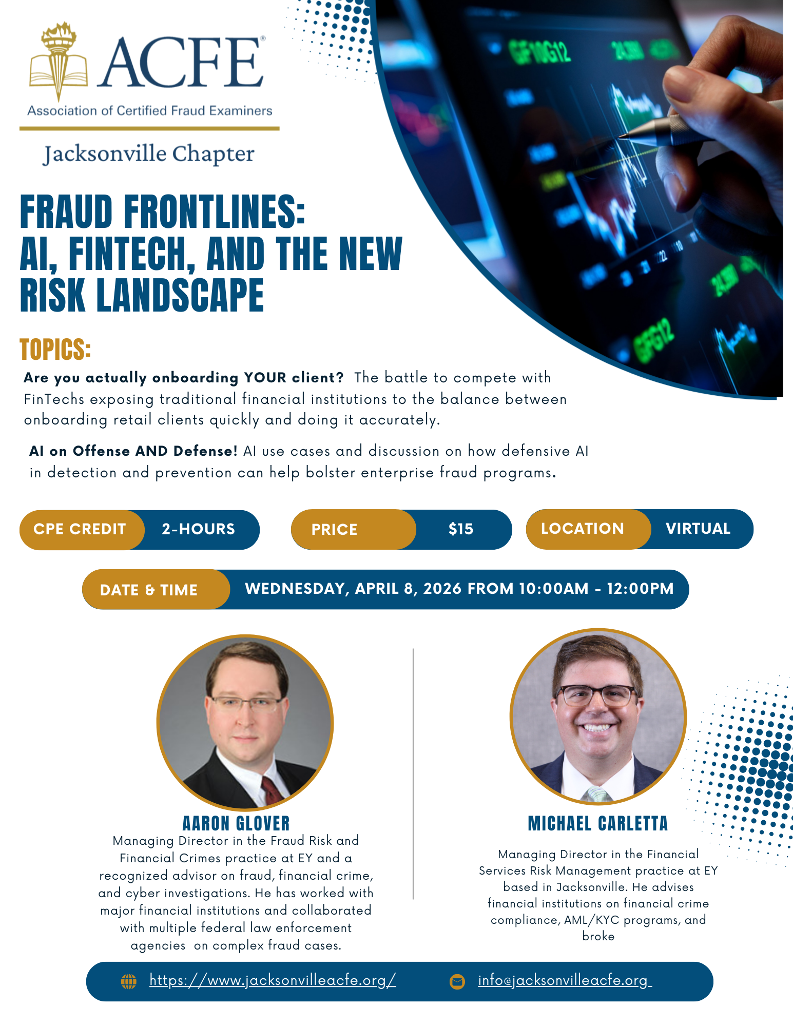 Join the ACFE Jacksonville Chapter for our first event of the year, earn 2 hours of CPE credit for only $15. As financial institutions compete with FinTech’s, balancing fast, seamless onboarding with accuracy is more critical than ever. This session also explores how defensive AI is transforming fraud detection and prevention, helping organizations strengthen enterprise fraud programs while protecting growth.
